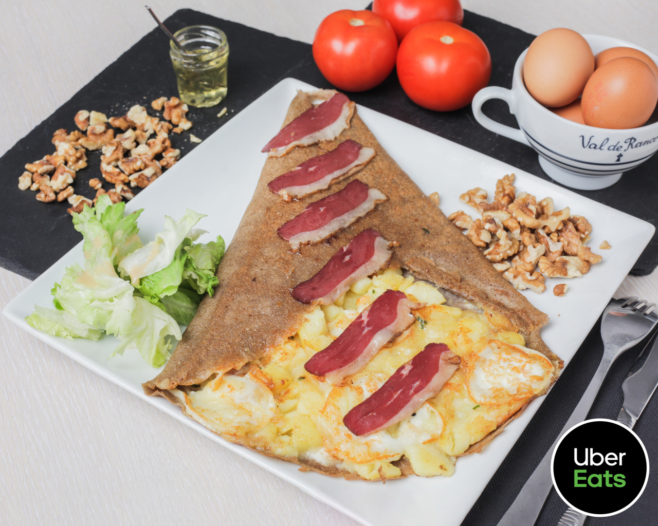 Crottin de chèvre frais, miel, noix, pommes de terre, magrets de canard fumés, salade.