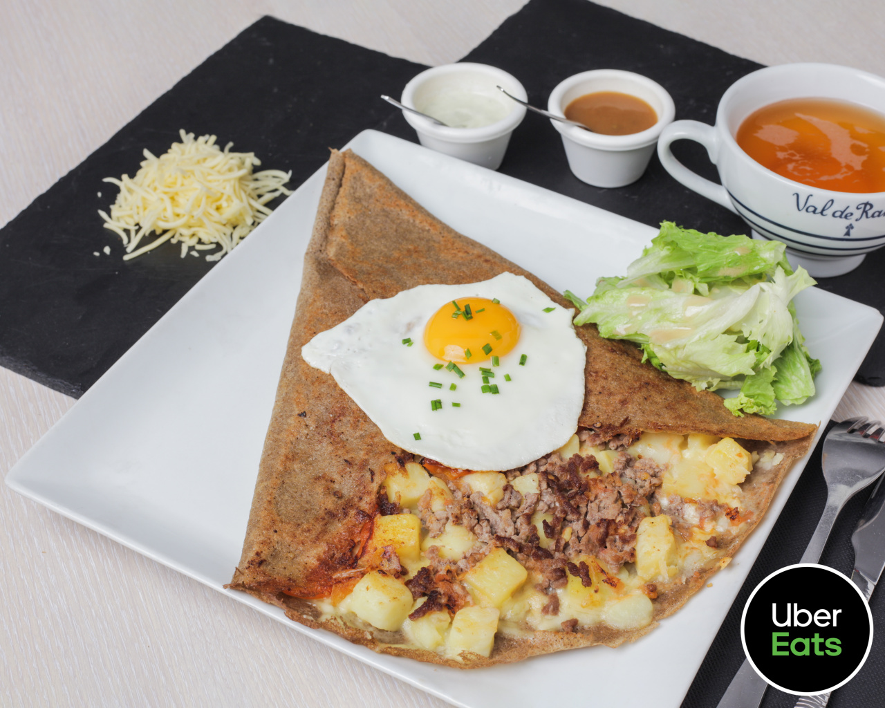 Emmental, pommes de terre, steak haché, crème fraîche, œuf miroir, Sauce au poivre OU sauce au bleu OU sauce moutarde maison, salade