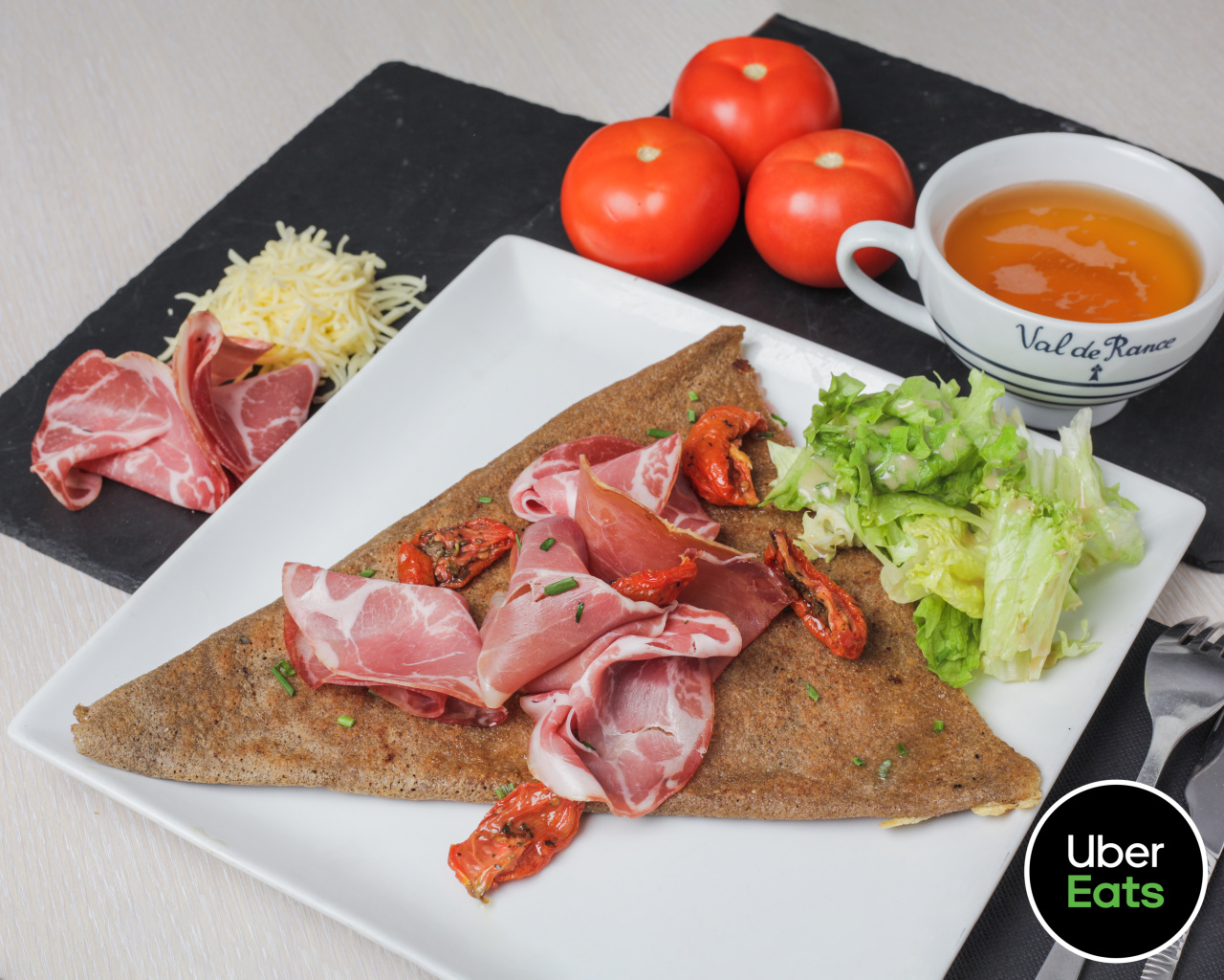 Emmental, tomates fraîches, chorizo, œuf miroir, salade.